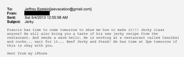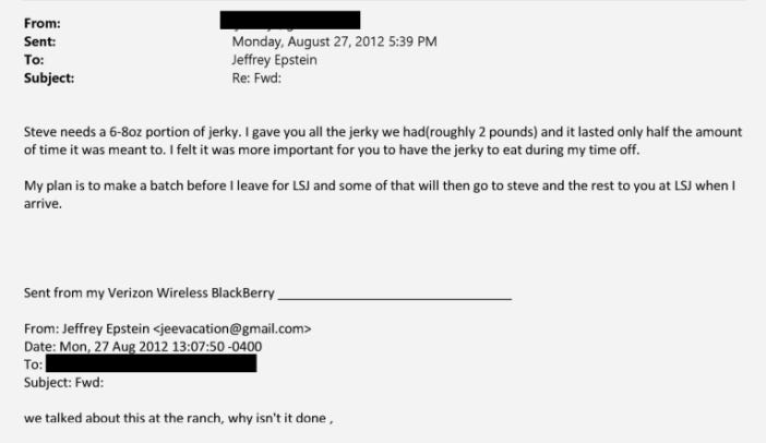 The archive contains a bewildering 177,000+ mentions of “jerky,” which some suspect could be a euphemism for human meat. Whatever it is, it’s clear that Epstein was having large amounts of “jerky” prepared at Zorro Ranch. In the emails, these are presented as beef jerky, and Epstein seemed to be addicted to it, finishing his portions quicker than expected and getting angry and frustrated at others when he runs out.